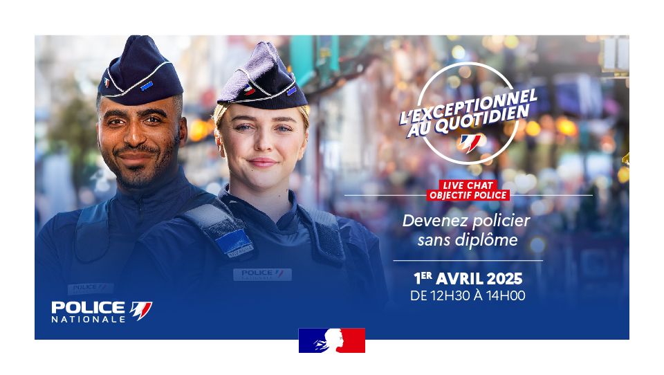 Inscrivez-vous au live-chat qui aura lieu le mardi 1er avril, de 12h30 à 14h00 et découvrez les 2 dispositifs « cadet de la République » et « policier adjoint » qui vont vous permettre d’intégrer la police sans condition de diplôme.
