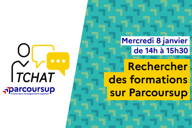 Le 8 janvier, de 14h à 15h30, un tchat avec les conseillers de l'Onisep et de Parcoursup est organisé pour vous accompagner et répondre à toutes vos questions sur la recherche de formations disponibles sur Parcoursup.